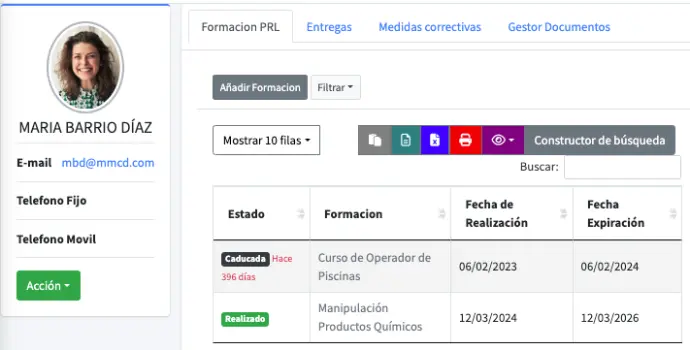 Por cada trabajador un expediente donde toda la documentación aparece ordenada y con etiquetas del estado en que se encuentra.